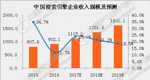 (上图为中商产业研究院对中国搜索引擎市场数据的统计。数据显示,2016年中国搜索引擎企业收入规模达到902.1亿元,同比增长11.7%,2016年中国搜索引擎行业受到政策的影响,企业收入规模增长有所放缓放缓。预计今后两年中国搜索引擎市场规模将超1000亿元。)